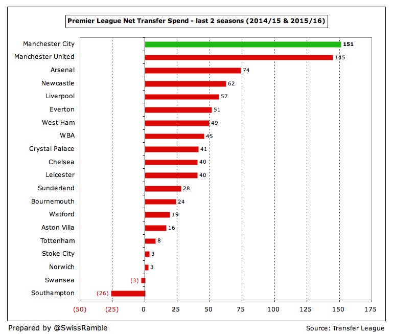 Nevertheless, City still have the highest net spend over the last two season of