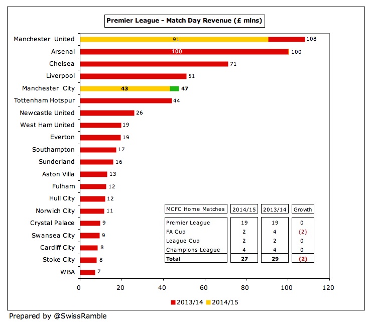 broadcast revenue up £2 million (2%) to £135 million, though match day revenue